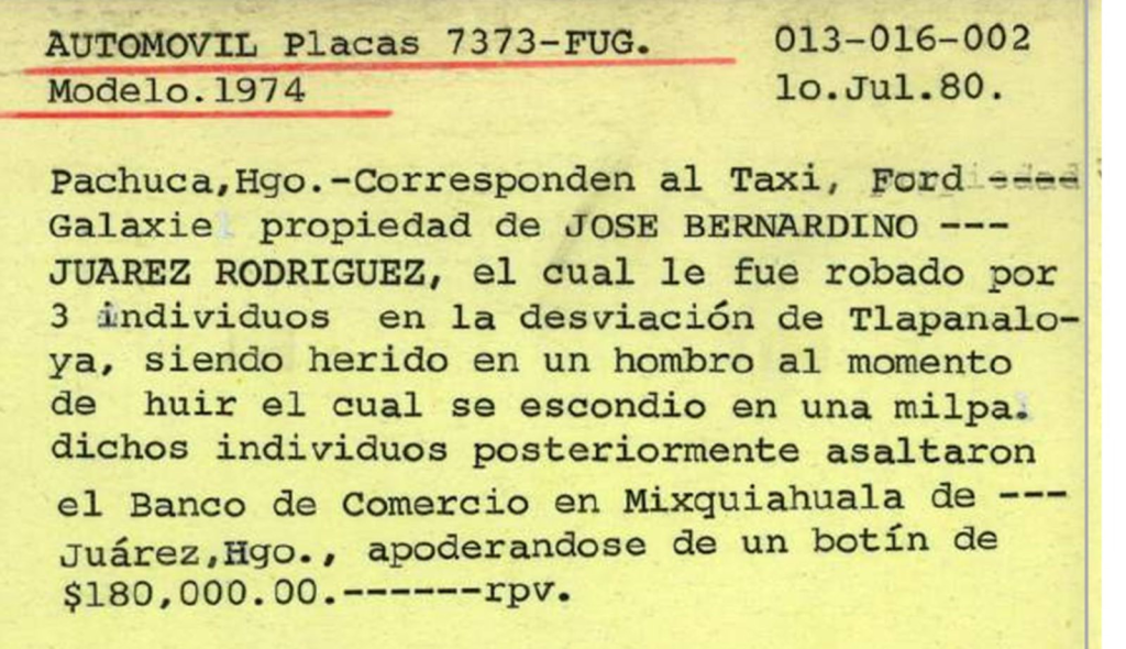 El 30 de junio de 1980, aproximadamente a las 10:15 horas, tres individuos abordaron un taxi Ford Galaxie modelo 1974, con placas 7373 FUG, conducido por José Bernardino Juárez Rodríguez, en el municipio de Atotonilco de Tula.
