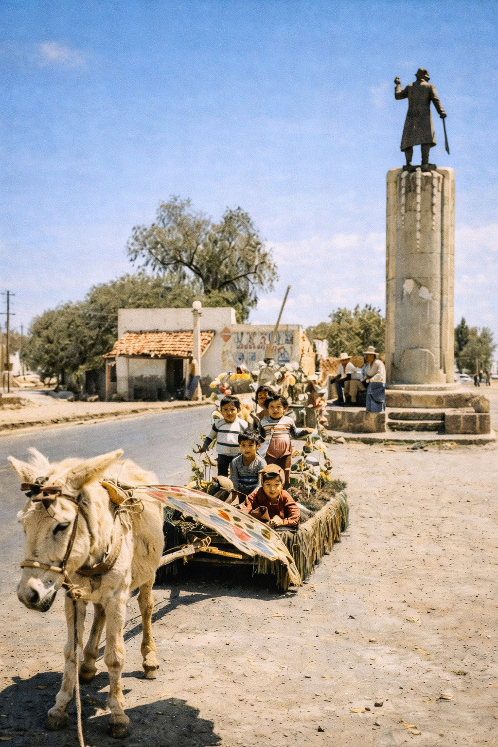 En esta imagen, tomada en la glorieta Morelos, se puede apreciar un colorido carro alegórico característico de la época, que participa en el desfile de primavera.